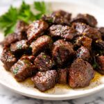To reheat, gently warm your steak bites in the air fryer or a hot skillet for a few minutes to regain crispness and avoid sogginess. Avoid microwave reheating if possible, since it tends to toughen the steak and mush the garlic butter sauce.