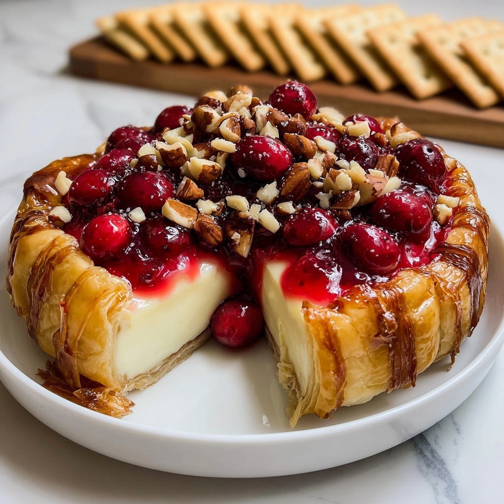 Indulge in the warm, gooey delight of baked brie wrapped in flaky puff pastry, topped with a sweet and tangy cranberry mixture enhanced with brown sugar, nuts, and fresh rosemary. This elegant appetizer is perfect for holiday gatherings or anytime you crave a sophisticated treat.