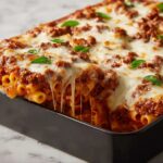 A classic Italian-American baked pasta dish featuring al dente pasta mixed with a rich, savory meat sauce, creamy ricotta, and fresh basil, layered with mozzarella and Parmesan cheeses, then baked until bubbly and golden on top. Perfect for a comforting family meal or gathering.