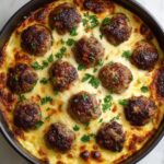 A comforting and hearty Cheesy Potato Meatball Casserole featuring seasoned ground beef meatballs layered between creamy, cheesy mashed potatoes, baked until golden and bubbly. Perfect for a family dinner with rich flavors and a satisfying texture.