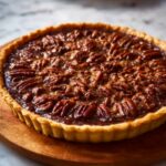 This Christmas Chocolate Pecan Tart is a luscious holiday dessert featuring a rich dark chocolate filling infused with butter and cream, topped with crunchy pecans for a perfect balance of texture and flavor. Baked in a pre-baked tart shell, this tart captures the festive spirit with its deep chocolate notes and nutty, caramel-like sweetness from brown sugar, making it an irresistible centerpiece for any holiday gathering.