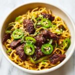 This Mongolian Beef Ramen Stir-Fry is a flavorful and comforting dish that combines tender cornstarch-coated flank steak, sautéed green bell peppers, and perfectly cooked ramen noodles all tossed in a rich, slightly sweet soy-based sauce. Ready in just under an hour, it’s an easy weeknight meal that marries savory, sweet, and spicy elements for a satisfying Asian-inspired stir-fry.