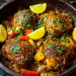 This Moroccan Chicken recipe features tender boneless skinless chicken thighs simmered in a fragrant blend of spices, tomatoes, olives, and dried apricots, creating a rich and aromatic North African main course. Enhanced with fresh herbs and lemon juice, it offers a perfect balance of sweet and savory flavors ideal for serving over couscous, rice, or with warm flatbread.