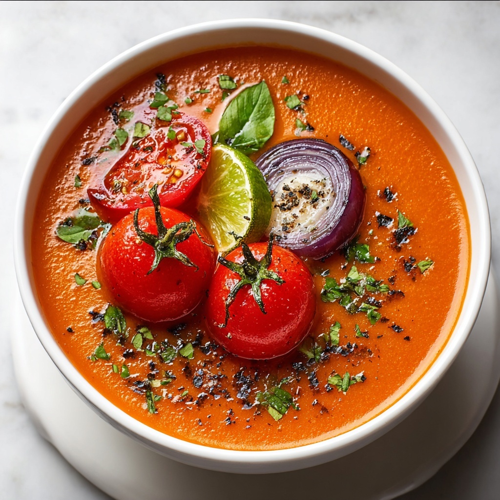 A comforting and flavorful roasted tomato soup made by caramelizing ripe tomatoes, garlic, and onions in the oven, then simmering with herbs and vegetable broth. Finished with a touch of balsamic vinegar and optional cream for richness, this soup is perfect for a cozy meal.