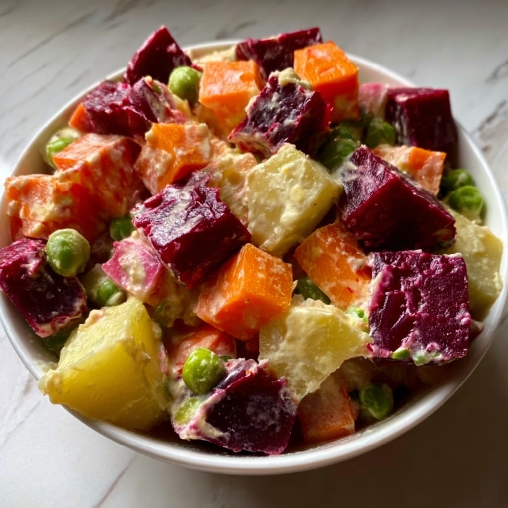 This easy beet salad is a traditional Russian-inspired dish featuring boiled beets, potatoes, carrots, and pickles combined with green peas, onions, and a creamy mayonnaise dressing. It’s a colorful, hearty salad perfect for a refreshing side or light meal, with vibrant flavors that meld beautifully after chilling.